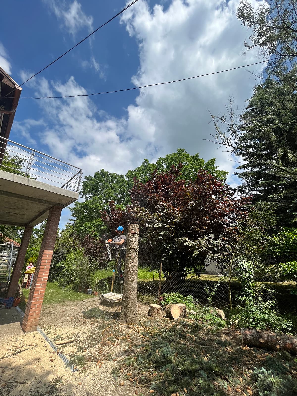 Veszélyes, beteg, oda nem illő fák kivágása alpintechnikával, kosaras autóval, láncfűrésszel.